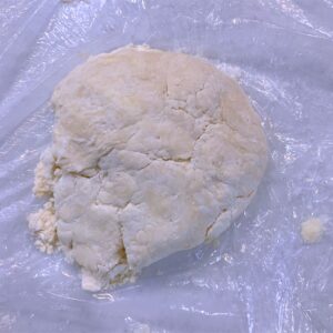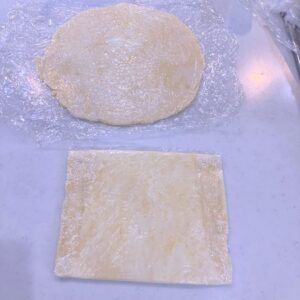 | 7 | パイ生地の下に敷く用を丸く、トップに乗せる生地を四角にして平らに伸ばし、冷蔵庫で一晩寝かせる。 | ![]() |