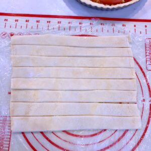 | 19 | 生地を格子状(ラティス)に交互に通して並べる。はみ出した部分はカットする。 | ![]() |